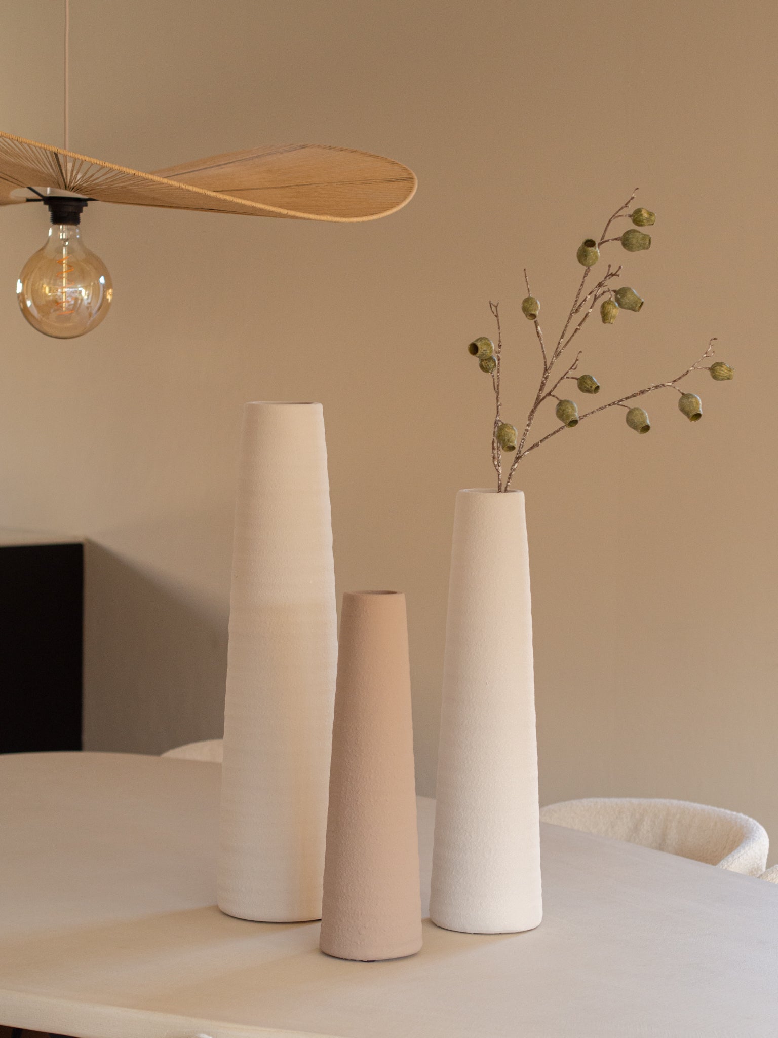 Mooie lange eucalyptus tak in een groene kleur. Mooi om zijn eenvoud. Combineer het met deze mooie witte vazen