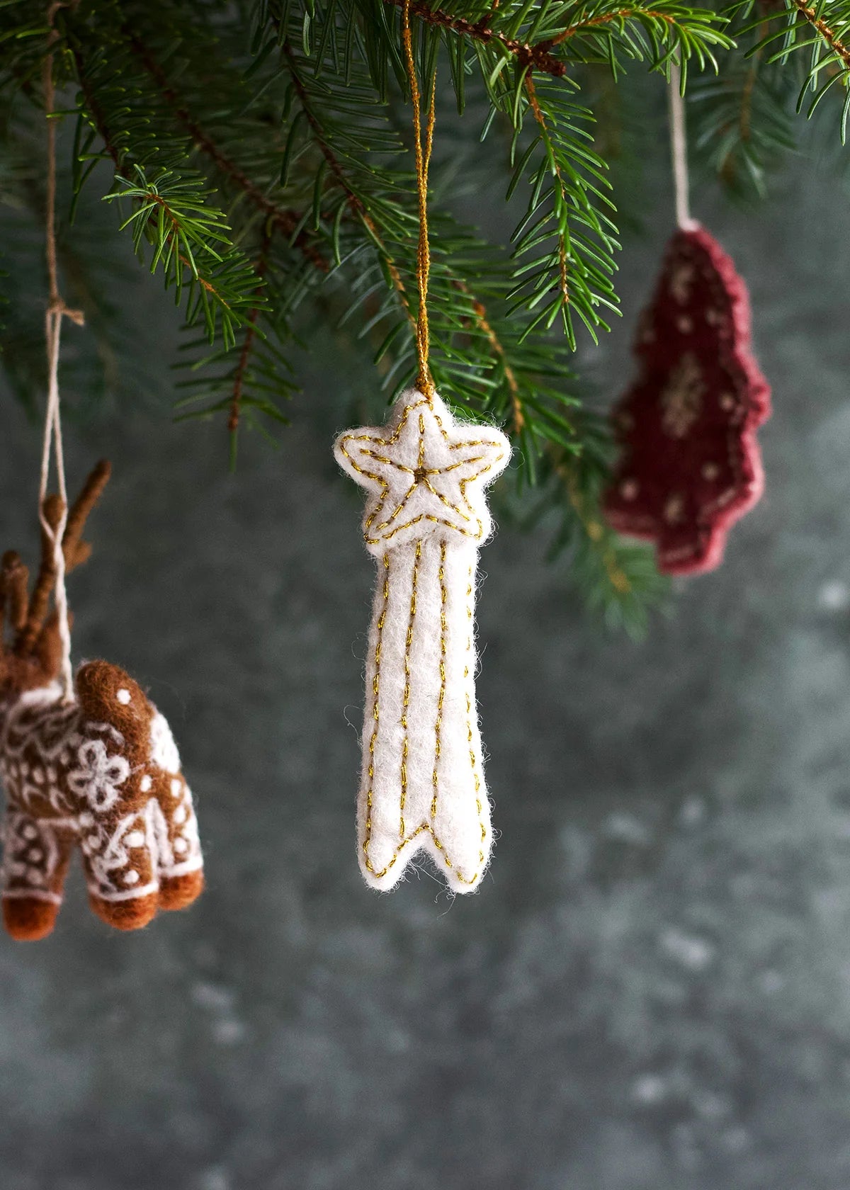 Handgemaakt vilten ornament in de vorm van een vallende ster, afgewerkt met gouden lijnen. Een feestelijk accent dat zorgt voor een vleugje sprankeling en charme in de kerstboom.
