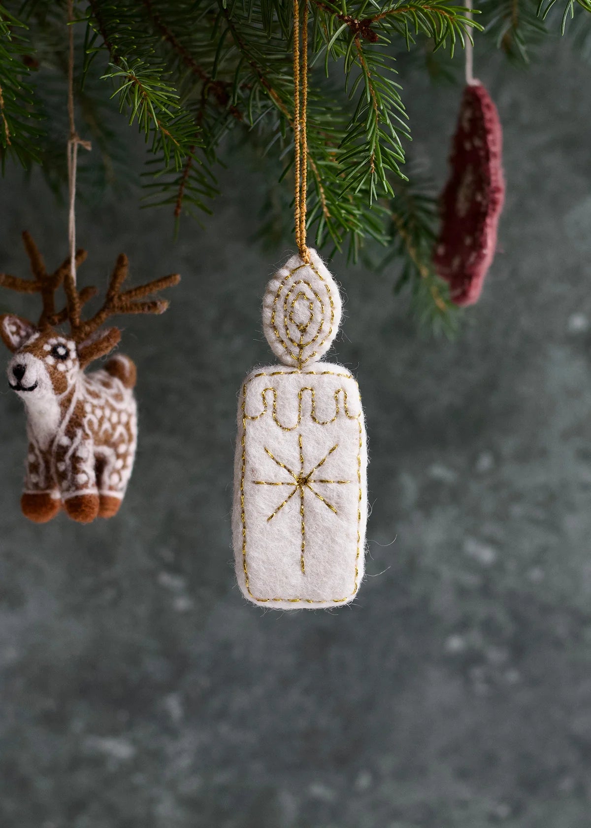 Prachtige handgemaakte hanger gemaakt van vilt en afgewerkt met een gouden detail! Super leuk voor in een krans of in de kerstboom.