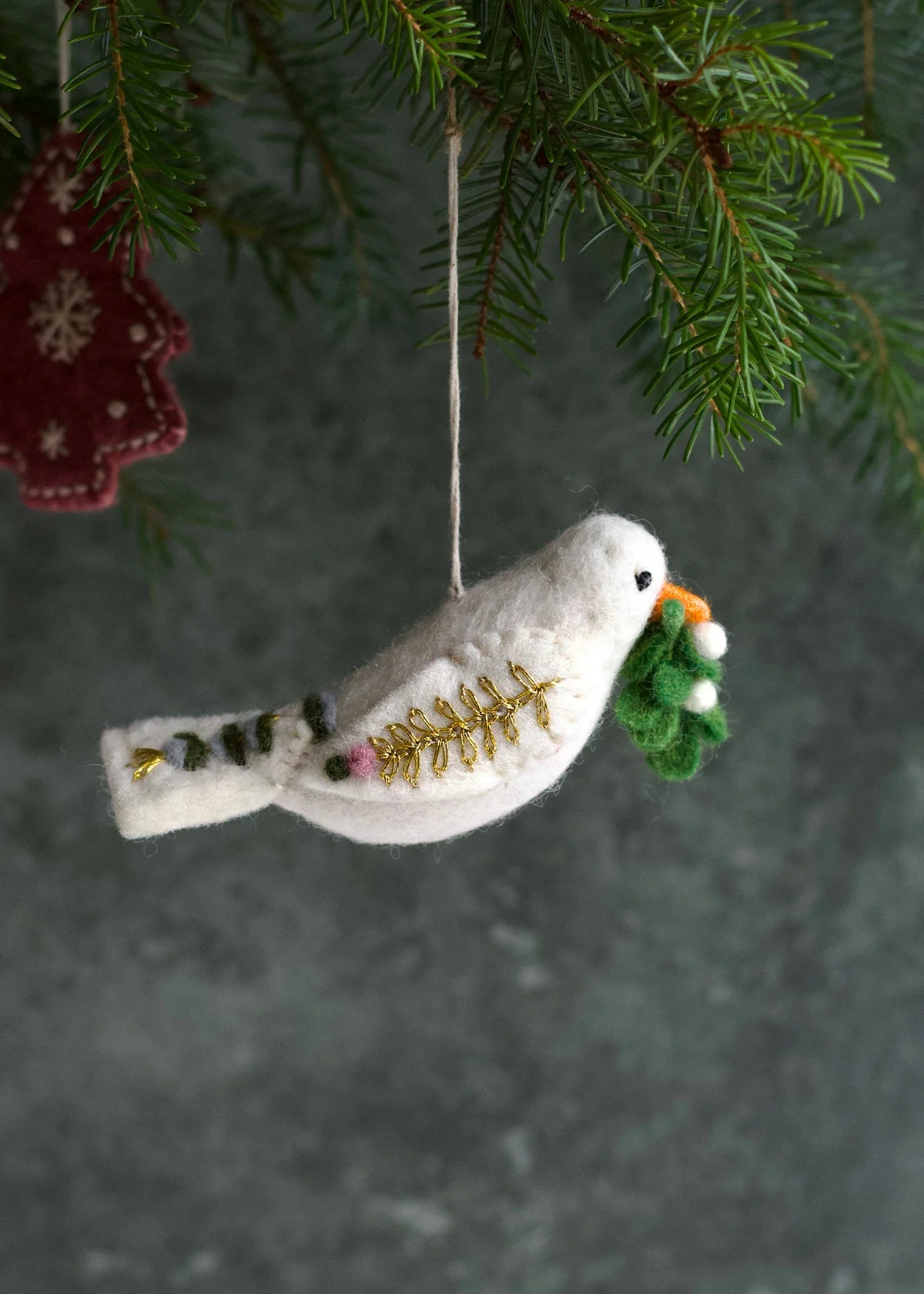 Handgemaakte vredesduif gemaakt van duurzaam vilt. Prachtige details zoals een gouden draad. De duif staat voor vrede en harmonie, de echte kerstgedachte.