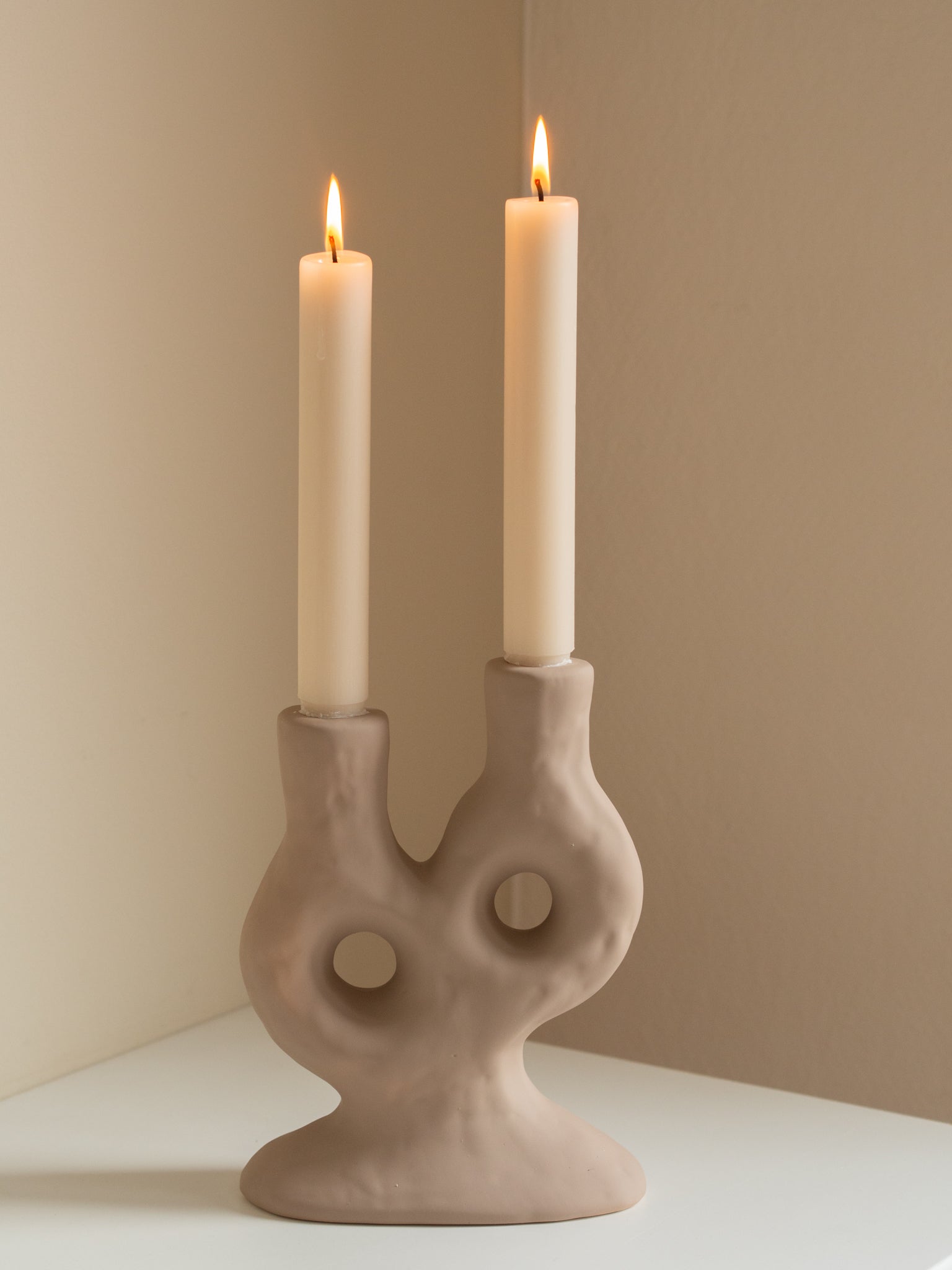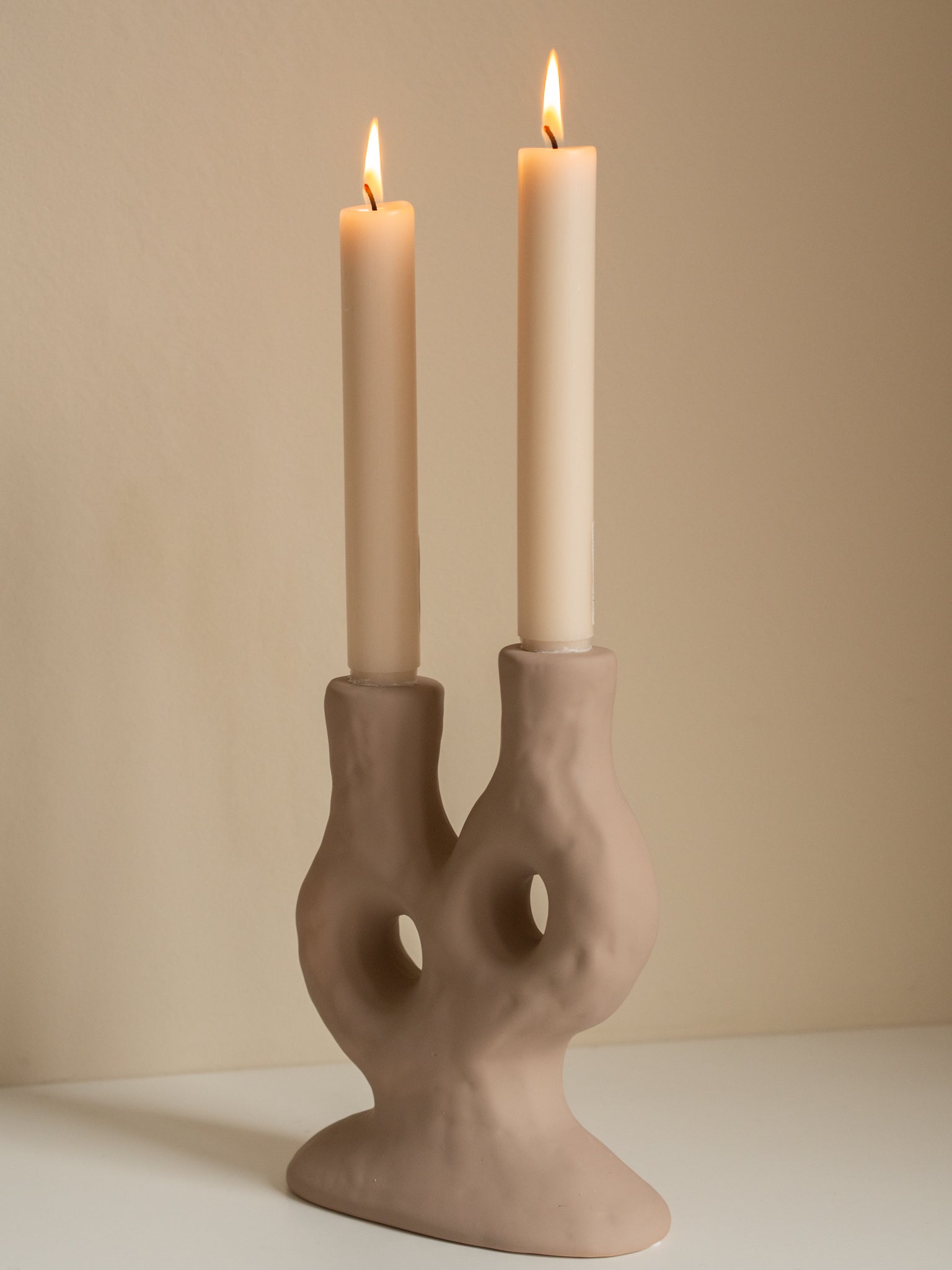 Prachtige organische kandelaar voor twee diner kaarsen in mooie warme kleuren.