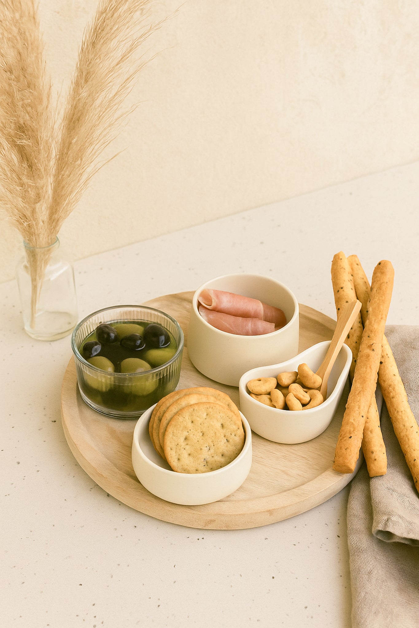 Super mooie set! De combinatie van naturel keramiek, glas en hout straalt rust en eenvoud uit, ideaal om hapjes, nootjes, olijven of crackers te serveren. Het minimalistische ontwerp in zachte tinten maakt dat deze set in elk interieur past, terwijl de ronde houten schaal zorgt voor een warme, natuurlijke uitstraling.