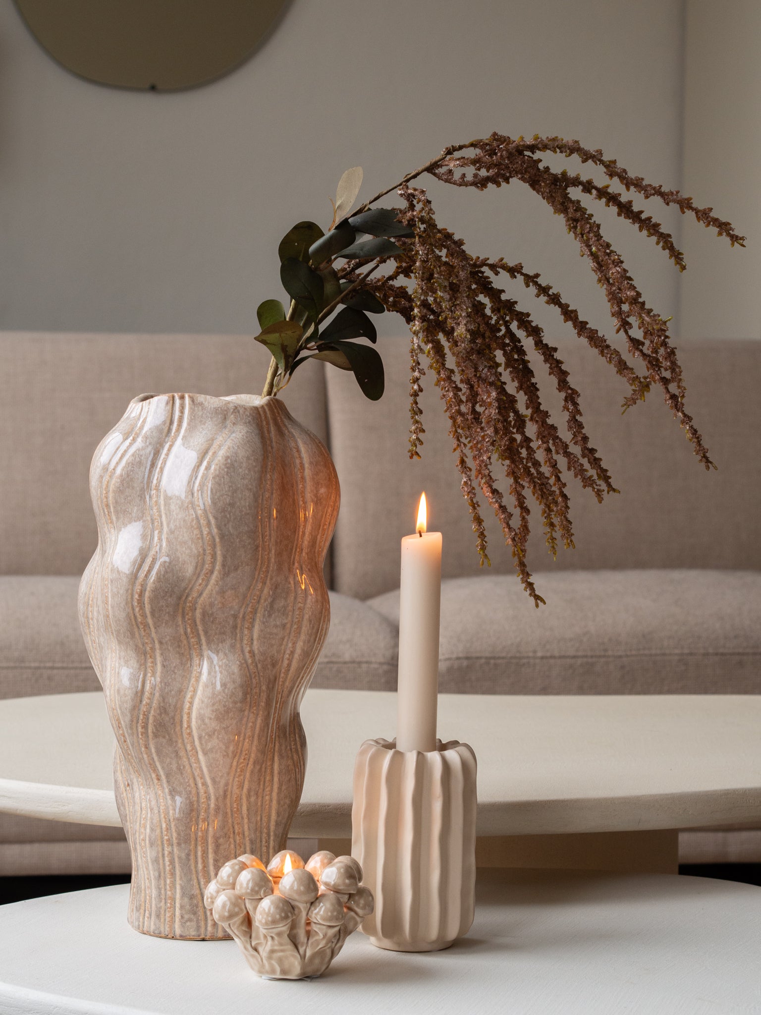 Prachtige unieke vaas in een mooie warme beige kleur. Door de hoogte en opening van de vaas is eigenlijk een zijden tak al voldoende om een mooi effect te creëren. Combineer het met een mooi dienblad, en kandelaren en je hebt een mooie set.