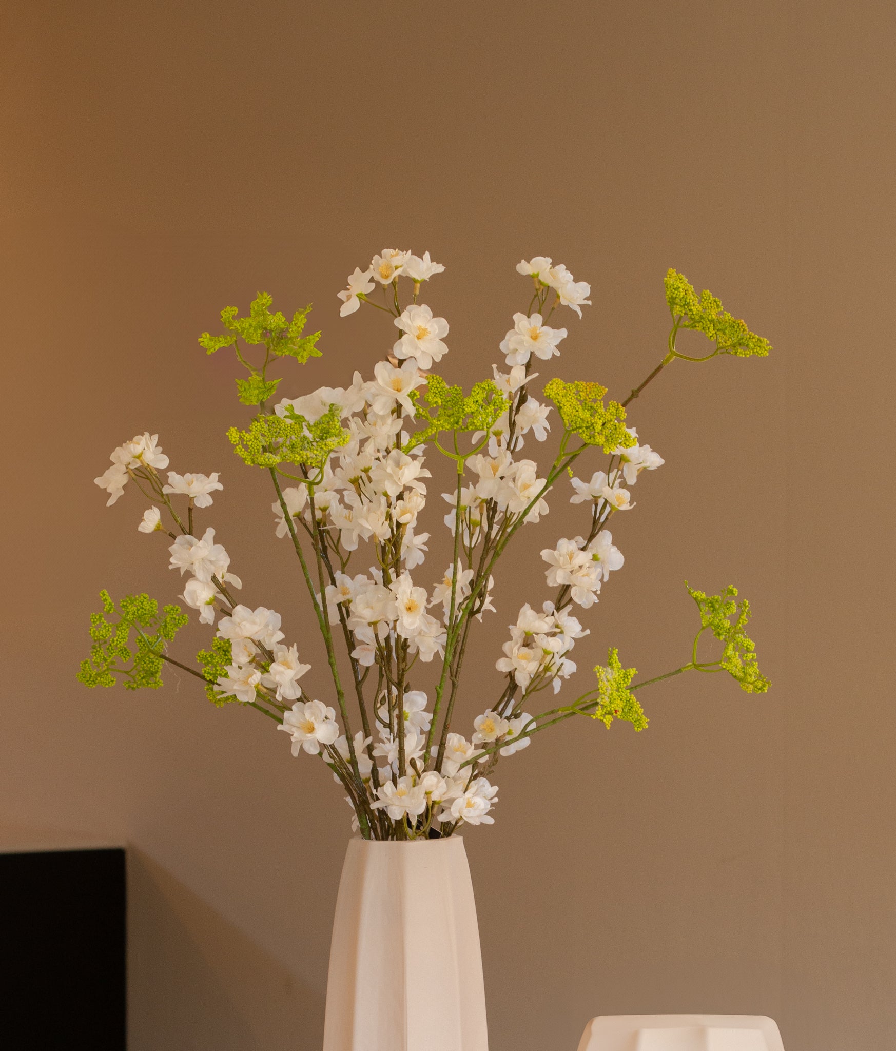 Prachtig fris groen zijden boeket. Bestaande uit 3 witte bloesemtakken en 2 frisgroene Anthriscus.